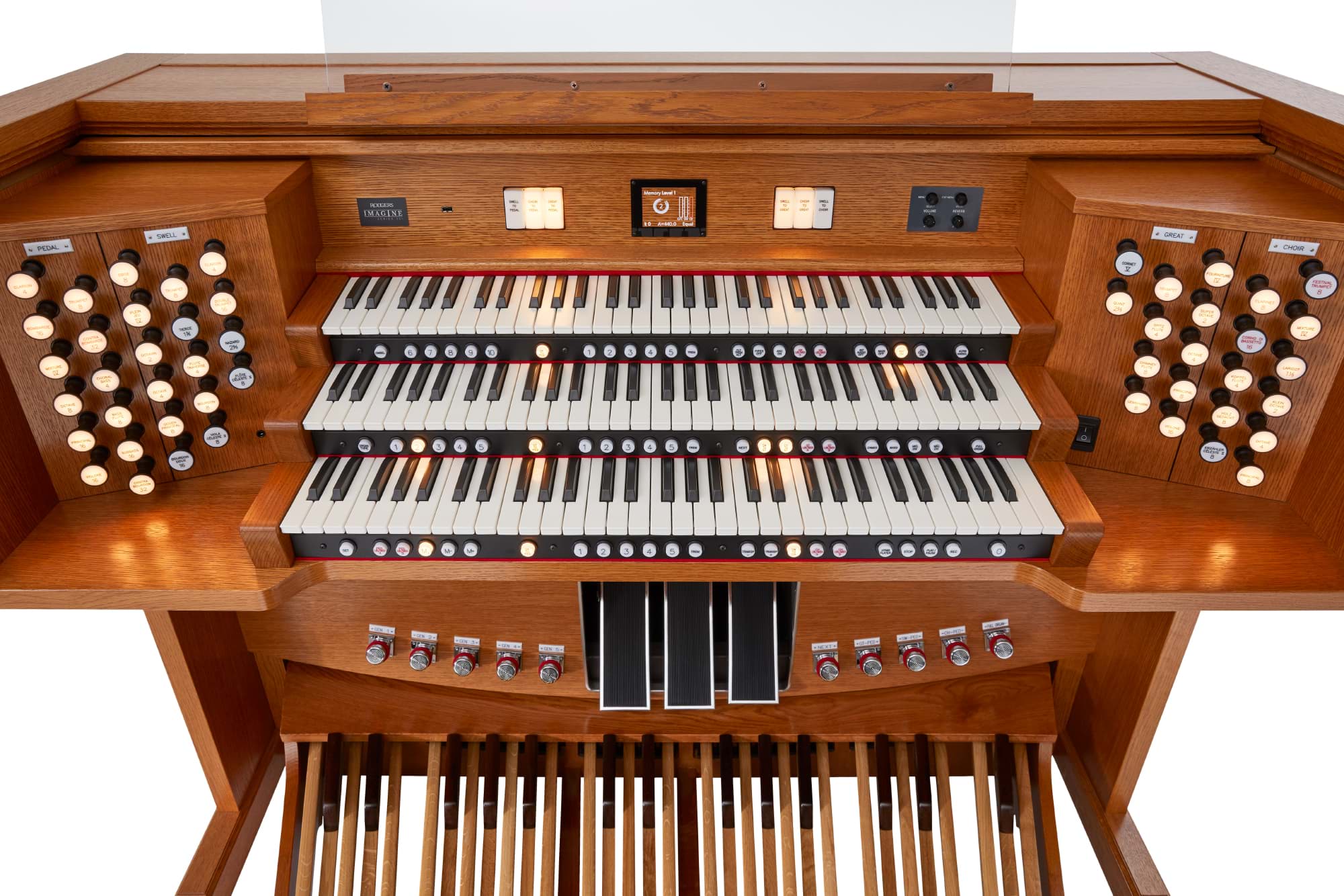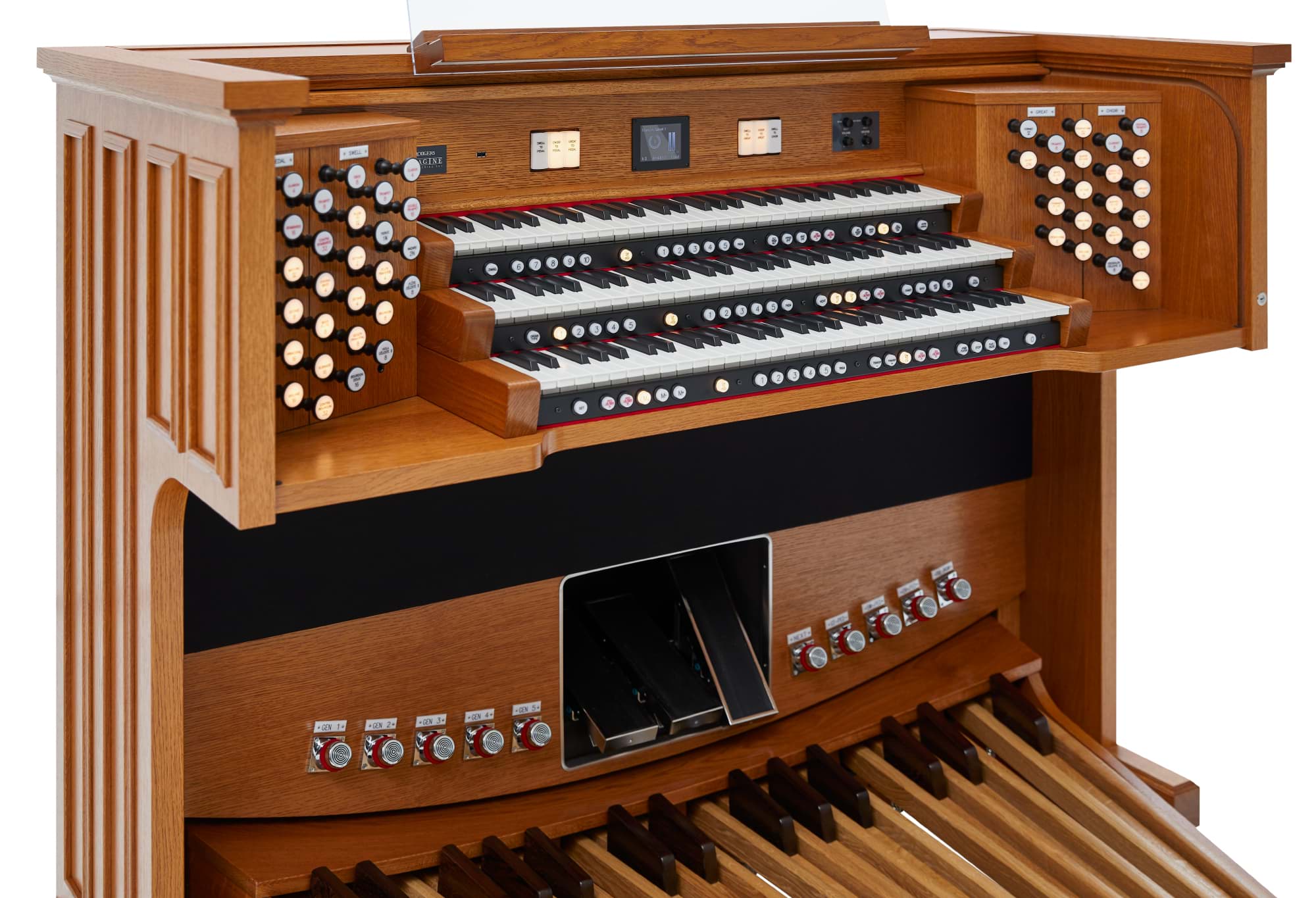 Manuale & Pedal: 3 × Performance Touch™-Klaviaturen (anschlagdynamisch, 128 Velocity-Stufen für Orchesterstimmen) und 32-töniges, radiales, anschlagdynamisches AGO-Pedal.