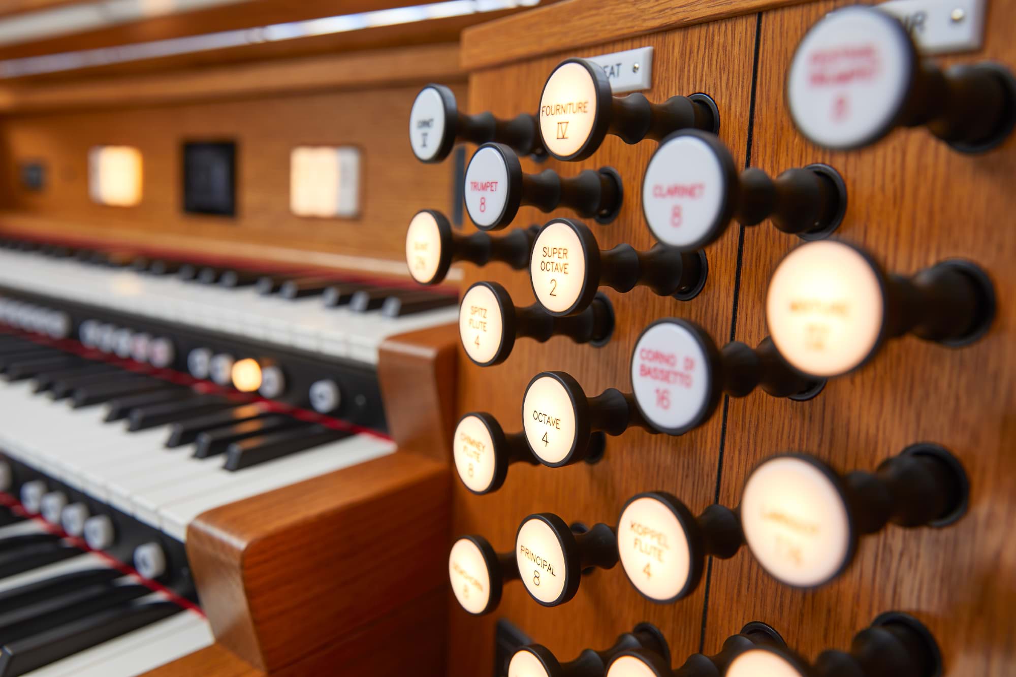 Bedienung & Speicher: 10 Generalpistons; Divisional: 5 Great / 5 Swell / 5 Choir / 5 Pedal; 99 Memory-Level pro Piston; 99 interne Memory-Bänke und praktisch unbegrenzt via USB; Memory ± und Next-Piston.
