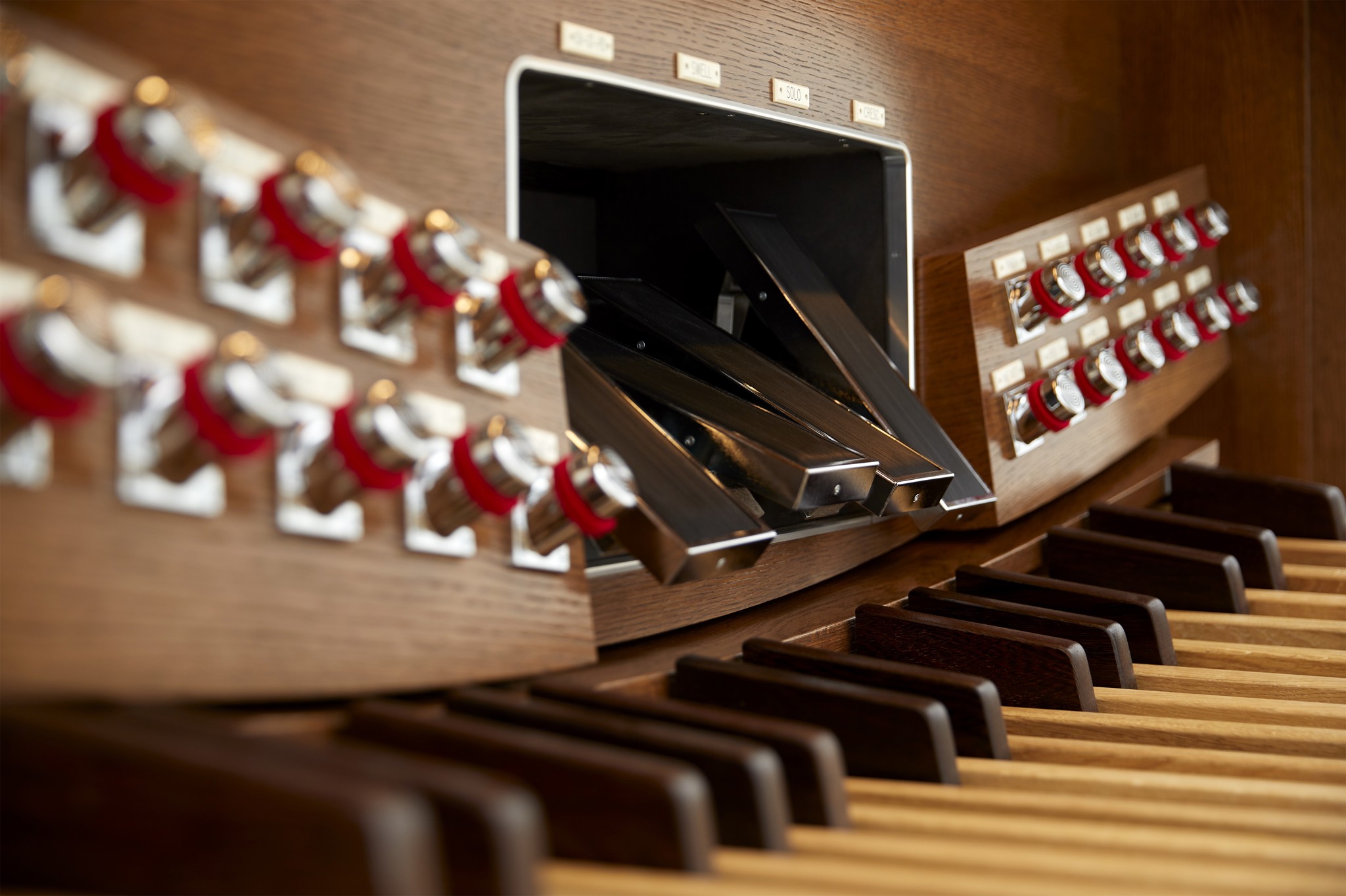 Manuale & Pedal: 4 × 61 Tasten (AGO-Standard); 32-töniges Pedal (radial-konkav).
