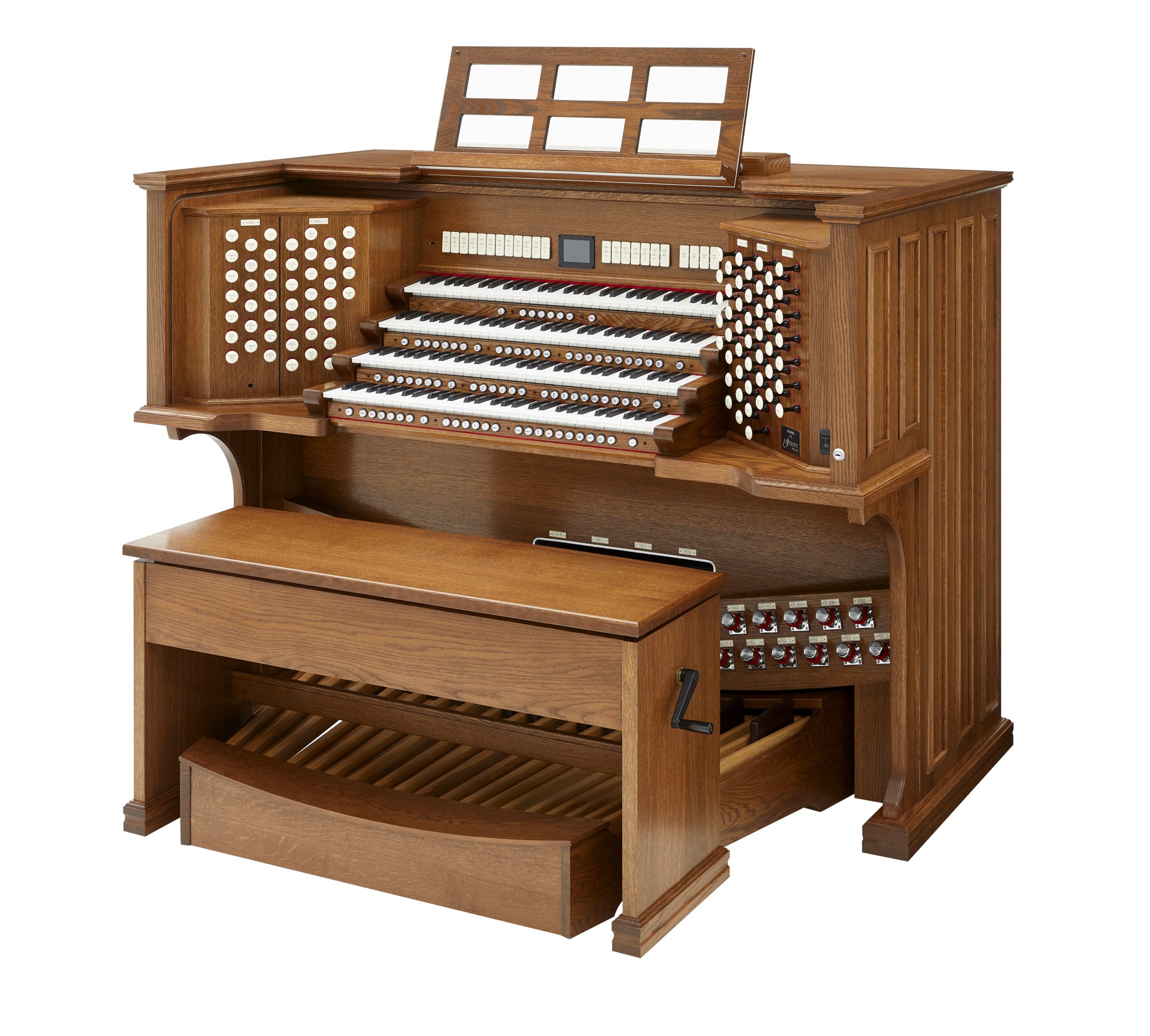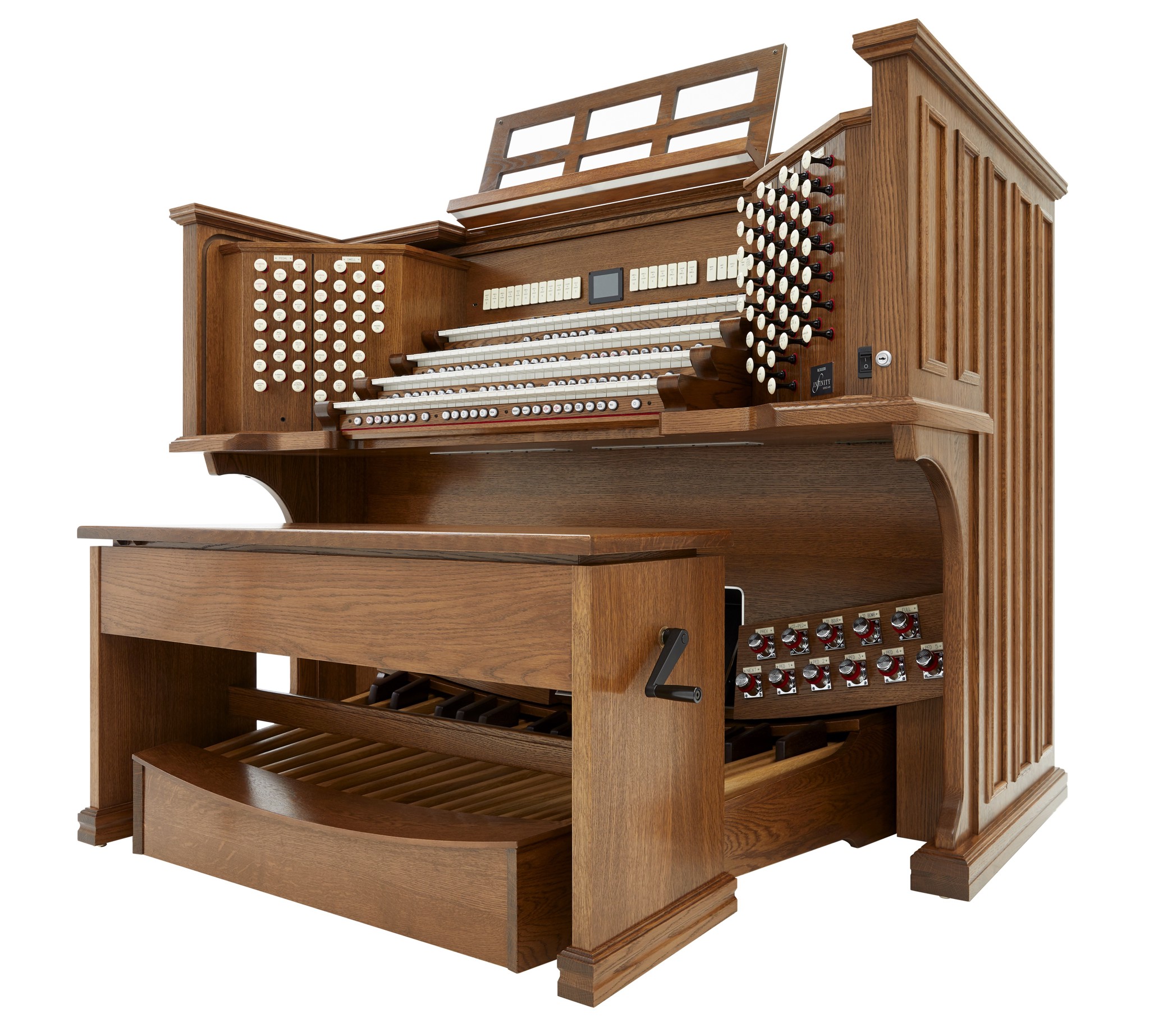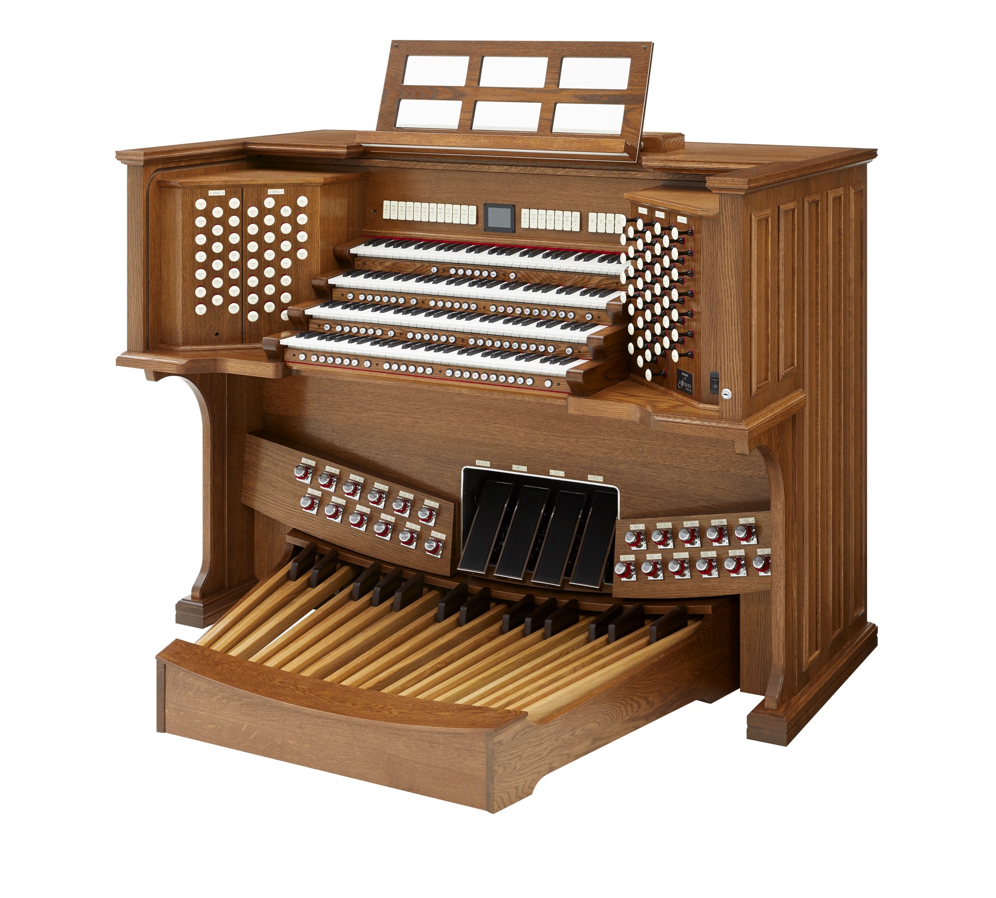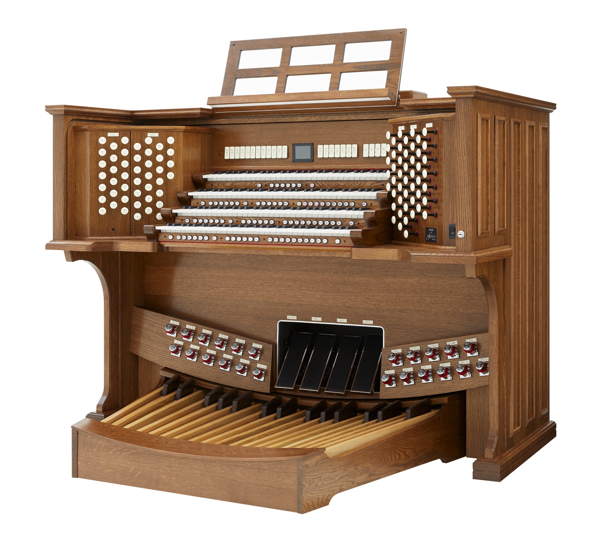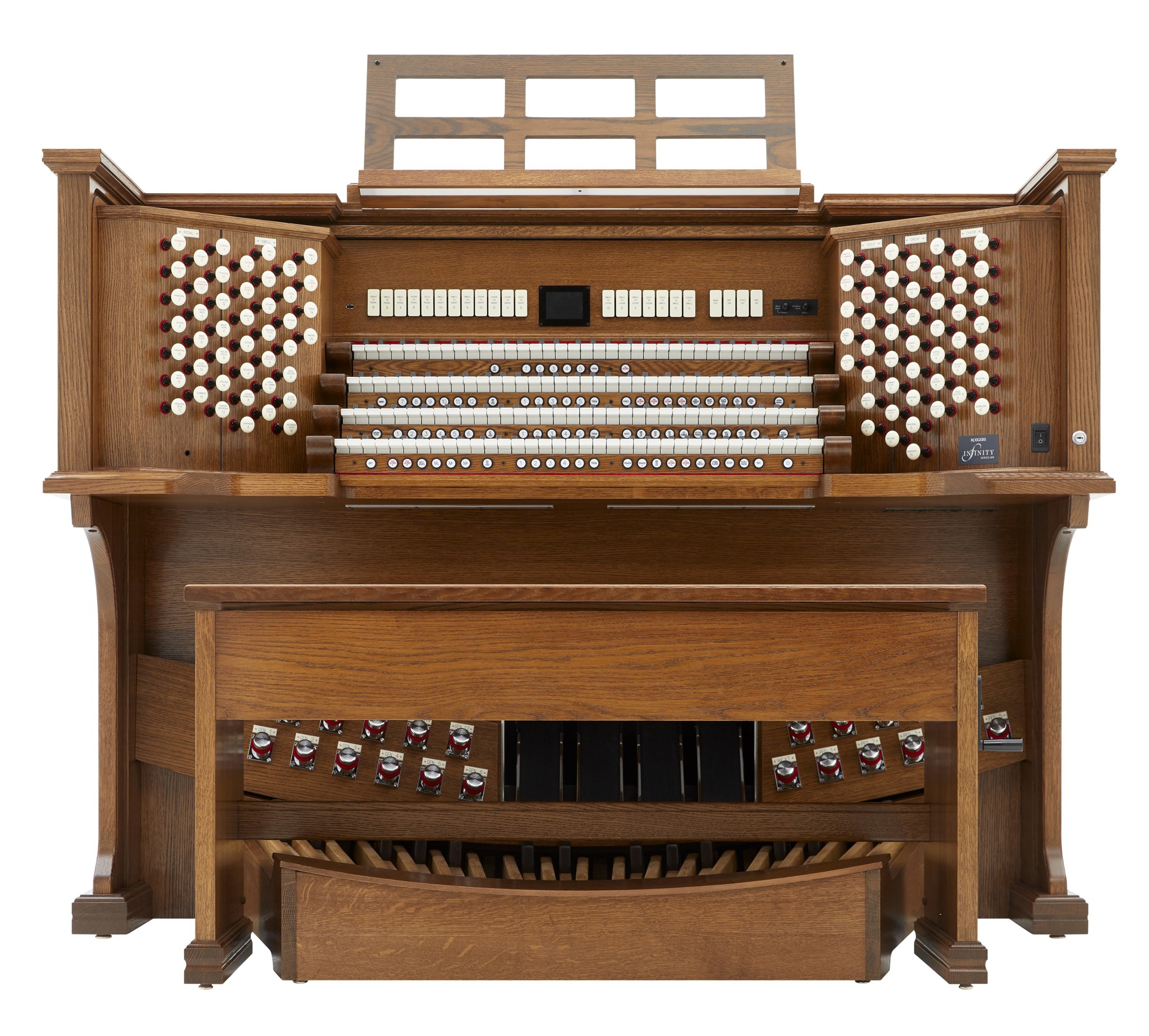 Die INFINITY 489 ist das Spitzenmodell der Infinity-Serie für große Kirchen, Kathedralen und Konzertorte. Die viermanualige Drawknob-Konsole (wahlweise beleuchtet oder mechanisch) vereint traditionelle Orgelhaptik mit modernster Digitaltechnik. Vier Orgelstile (American Eclectic, English Cathedral, French Romantic, German Baroque), eine massiv erweiterte Stop-Library, zahlreiche Orchesterstimmen sowie eine floating Solo Division ermöglichen eine außergewöhnliche klangliche Bandbreite. Mit Pipe-Kompatibilität, erweitertem Multikanal-Routing und großem Audio-Headroom ist die 489 optimal für umfangreiche Beschallungs- oder Hybridanlagen ausgelegt.